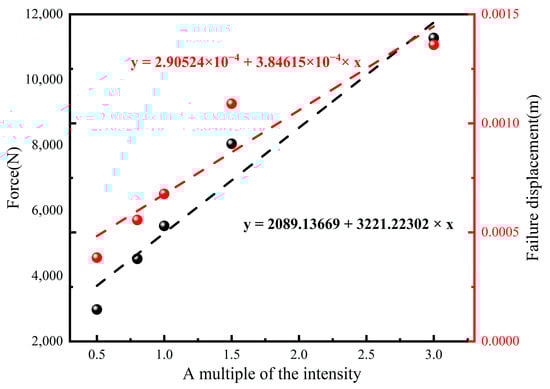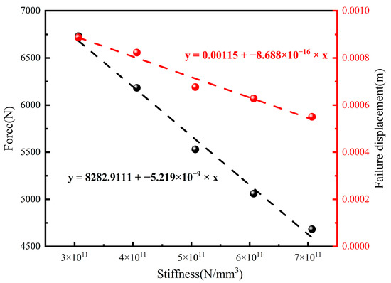 The outcomes revealed that both strength and failure displacement decreased as interface stiffness increased. This behavior could be attributed to the potential stress concentration near the interface due to elevated stiffness. Consequently, materials near the interface could experience higher stress levels, leading to a reduction in the interlayer bonding strength. The analysis indicated that interface stiffness values between 5.069 × 1011 and 6.069 × 1011 N/mm3 yielded a good agreement with the actual strength values and improved the computational convergence. Therefore, when simulating the propagation of Type I cracks between a steel bridge deck and asphalt paving layers, an interface stiffness value in the range of 5.069 × 1011 to 6.069 × 1011 N/mm3 is recommended. Figure 19 depicts the predicted curves of strength and failure displacement, revealing a notable linear relationship between them.