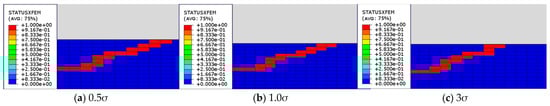 To investigate the effects of different interface strength values on crack propagation between layers and the predicted interface strength, the interface strength was represented by σ. Specifically, 0.5σ signified half of the interface strength. Simulations were conducted using interface strength values of 0.5σ, 0.8σ, 1σ, 1.5σ, and 3σ. The findings revealed that changes in interface strength had minimal impact on crack propagation paths. As the strength increased, the variations in the crack propagation paths became negligible. When transitioning from 0.5σ to 3σ, the crack consistently penetrated 15 elements, as shown in Figure 20.