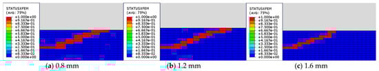 Based on practical engineering experience, the thickness of the bonding layer also significantly influences the interlayer bonding strength. To explore the effects of different bonding layer thicknesses on interlayer strength, simulations were conducted using bonding layers of 0.8, 1.0, 1.2, 1.4, and 1.6 mm thickness for Type I crack propagation. The results indicated that with an increasing bonding layer thickness, the crack propagation path within the bonding layer gradually enlarged. When the thickness was 0.8 mm, the crack penetrated 13 elements. However, as the thickness increased to 1.6 mm, the crack extended through 17 elements, as shown in Figure 23.