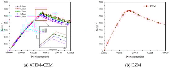 Furthermore, the thickness increase also notably affected the load–displacement curves, as depicted in Figure 24a, with a comparison to the CZM method shown in Figure 24b. The graphs illustrate a trend where the bonding layer strength initially increased and then decreased, as depicted in Figure 25. When the thickness increased from 0.8 mm to 1 mm, the interlayer strength improved, while a decrease in the interlayer strength occurred during the transition from 1 mm to 1.6 mm. Consequently, for optimal structural integrity during pavement construction, it is advisable to control the bonding layer thickness to enhance overall strength while avoiding excessive thickness. A recommended thickness of around 1 mm is suggested. When the adhesive layer is too thin, it fails to provide a sufficient bonding area, thereby lacking the required adhesive strength and weakening the bonding effect between materials. On the other hand, when the adhesive layer is too thick, internal stress concentration may occur, leading to the premature failure of the adhesive layer.