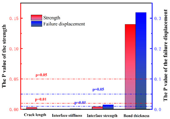 From the p-values presented in Figure 26, it can be observed that the significance order for strength and failure displacement was as follows: interface stiffness > crack length > interface strength > bonding layer thickness. Therefore, the results highlighted that changes in interface stiffness had the most substantial impact on strength and failure displacement. In areas where Mode I cracks are likely to occur, appropriately adjusting the interface stiffness may reduce the likelihood of crack formation.
