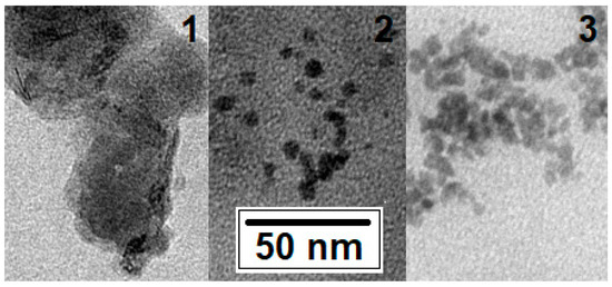 The sizes of the NPs for all three variants were approximately the same and correlated with the X-ray phase-analysis data (from ~5 to 20 nm). The NP Nos. 1 and 3 were found to be the most aggregated. The least aggregated and those with clear boundaries were those from No. 2, the composition of which corresponded to a solid solution in the middle of the magnetite–maghemite series.