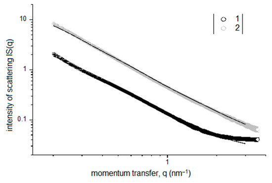 Double logarithmic-scale plots of the SAXS intensity IS(q) for the silica sols with TEOS concentrations of 1 and 10 vol. % are presented in Figure 4. These data show that an increase in the TEOS concentration in the sol leads to a significant increase in the observed small-angle scattering, which is apparently due to an increase in the number of SiO2 NPs in the sol and can be interpreted as an increase in the number of structural fragments responsible for film formation.