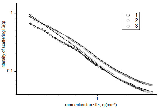 The SANS intensity IS(q) plots for the silica sol/FexOy NPs with FexOy NP (No. 2) concentrations of 0.001, 0.1, and 10 mg FexOy NP No. 2/L silica sol are shown in Figure 6. The presented data indicate that the increase in the FexOy NPs concentration in the sol-gel compositions resulted, as expected, in the growth of the observed SANS intensity due to an increase in the total amount of NPs caused by the addition of FexOy NP No. 2 to the sol-gel compositions.