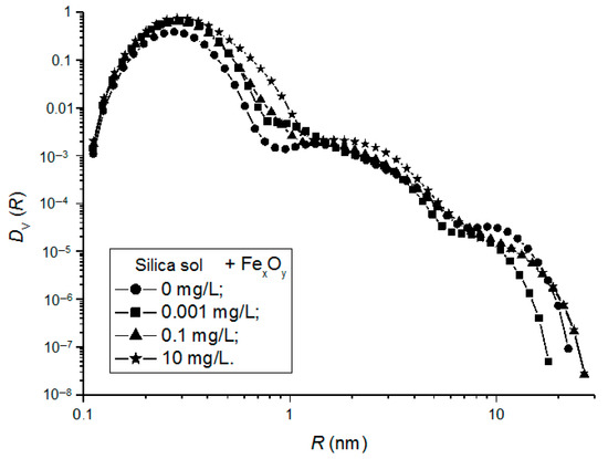 Similar to the silica sols, the distribution functions DV(R) of the scattering particles in the silica sol/FexOy NP compositions were derived and shown in Figure 7.