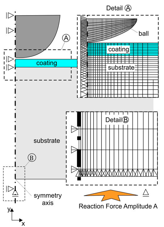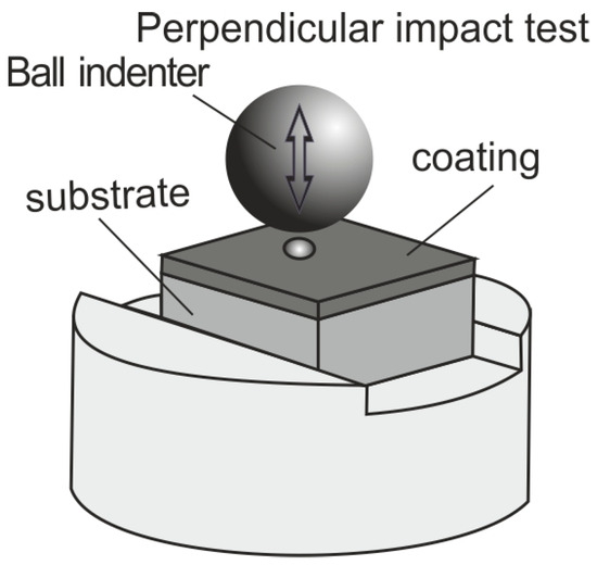 The kinematics of the impact loading of a coated surface can be simulated by the repetitive impacts of a cemented carbide ball indenter on the coated specimen (see Figure 1) [1,22,23,24]. In this experimental procedure, the substrate commonly deforms elastically and plastically, and the coating, elastically. Moreover, the impact test at elevated temperatures is a convenient experimental method for characterizing coating fatigue up to a temperature of approximately 500 °C [1]. Usually, the ball-indenter material is cemented carbide. Its elastic and potential plastic deformation, according to the impact load magnitude, is determined using an FEM simulation of the ball indenter’s penetration into the coated specimen, as described in the following figure.