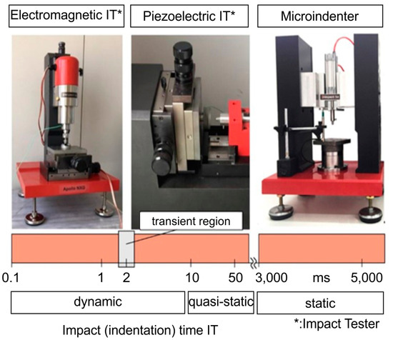 Devices developed to carry out this process at various impact loads and durations are exhibited in Figure 2. The motion data of the ball indenter (force magnitude and impact duration) are adjusted by the control units of the impact-testing instruments illustrated in Figure 2. The adjustment of impact duration is necessary, among other factors, to simulate the entry duration on the cutting edge during milling under various process conditions. With the aid of the electromagnetic impact tester, impact times less than 1 ms can be realized; whereas using the piezoelectric impact tester, impact times can be selectively achieved to be longer than 1 ms up to a few tens of ms. The adjusted impact force grows almost linearly up to a maximum value. This time course of the impact force remains constant in the sequential impacts. By means of the micro-indenter, practically quasistatic loads of several seconds duration up to the desired maximum force can be adjusted. The introduced impact devices are manufactured by Impact BZ Ltd. (London, UK) [25].