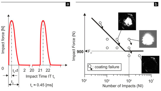 Depending on the impact load, the number of impacts and impact duration, a coating failure may occur. In the demonstrated investigations in Figure 3, an electromagnetic impact tester was used at ambient temperature and an impact time duration td of approximately 0.45 ms, as shown in Figure 3a. According to the demonstrated results, the coating withstood one million impacts without damage up to an impact force of 900 N (see Figure 3b).