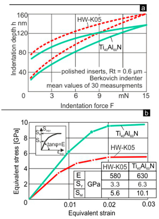 (a) Nanoindentation results on the applied K05 substrate and TiAlN coating; (b) calculated stress–strain curves of the employed coating and its substrate.