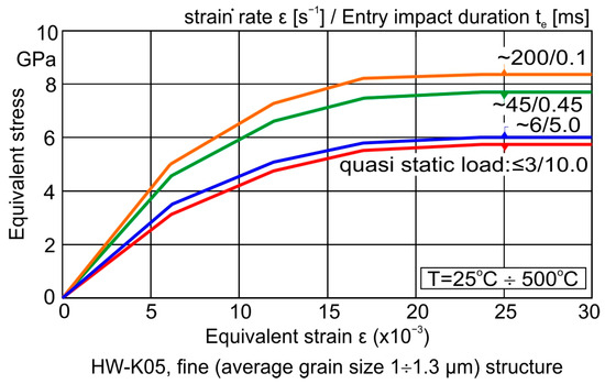 PVD coatings commonly have a thickness of only a few microns and are deposited on substrates with significantly larger dimensions. Thus, the coating deformation magnitude is practically imposed by the strains developed in the substrate. Herein, potential coating strains induced by dynamic phenomena of the coating material itself can be considered as negligible compared to those caused by the substrate deformation. Hence, if the strain–strain-rate dependency of the substrate material is available, the related coating deformation at various strain rates can be determined based on the coating static constitutive law and the substrate relevant dynamic data [27]. In these calculations, according to the impact time, the appropriate substrate material properties illustrated in Figure 6 must be employed.