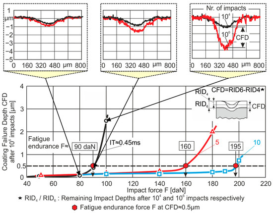 The presented results in Figure 8 ascertain this statement. The horizontal branch of the curve in the plot in this figure indicates the fatigue endurance forces at various impact times ITs. A fatigue damage criterion is considered as a coating failure depth CFD of 0.5 μm over the remaining coating imprint depth after 104 impacts, due mainly to plastic substrate deformation. The imprint geometries, demonstrated in the upper part of Figure 8, were measured using a confocal microscope by Nano Focus Ltd. For example, at an impact time of 0.45 ms, the fatigue critical force for 106 impacts amounts to about 900 N. The fatigue critical forces correspond to maximum stress, strain, and strain-rate of the related fields which were predicted by means of the previously described FEM simulation of the impact test. These stress, strain, and strain-rates are considered as fatigue critical ones at the corresponding impact times IT, i.e., strain rates. Impact forces imposing strains larger than the fatigue critical one at a certain strain rate cause micro-cracks in the coating structure. Through their propagation, coating fractures occur after a certain number of impacts according to the inclination of the Woehler-like curve.