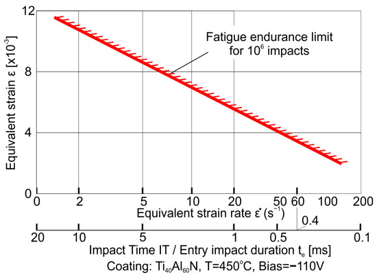 Using the previously described analytical–experimental procedure, the dependency between the coating fatigue critical equivalent strain and strain-rate, as well as impact time IT, can be predicted. Such a dependency is exhibited in Figure 9. This diagram will be considered to explain coating fatigue failures in milling based on coating and substrate stress, strain, and strain-rate material data.