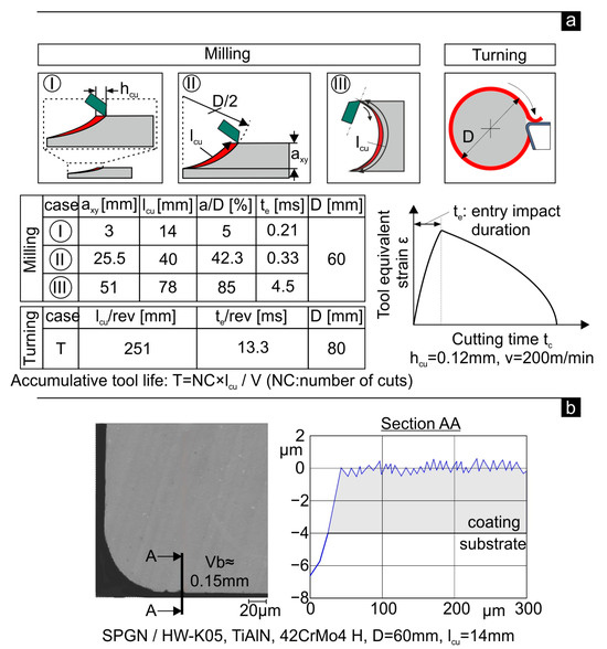 The performed wear-investigations in milling were appropriately planned to attain various entry impact durations te. The parameter te is defined as the average time tc up to the development of the maximum strain in the coated cutting edge during its entry into the workpiece, as exhibited in Figure 10a. At a constant cutting speed, te depends mainly on the relation between the radial depth of cut a to tool diameter D (a/D ratio) [1]. For achieving various te in milling, D was held as a constant equal to 60 mm, and the depth of the cut was increased from 3 mm up to 51 mm. In this way, the a/D ratio grew from 5% up to 85% (see Figure 10a). Hence, it was possible to perform milling investigations at te from about 0.21 ms up to 4.5 ms, as illustrated in the table of Figure 10a. The latter impact time te values correspond to strain rates less than 200 s−1 (see Figure 6). The related cemented carbide constitutive law for a certain te is defined via interpolation between constitutive laws of neighboring impact times. The factor te in turning corresponds to the duration of one workpiece revolution, i.e., to the time of reaching the maximum undeformed chip thickness hcu of 0.12 mm.