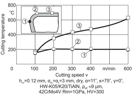 The maximum calculated temperature in turning varies depending on the cutting speed as well as the location on the tool rake, as illustrated in Figure 11. The developed maximum temperatures in positions 1 and 2 amount to approximately 160 °C at a cutting speed of 100 m/min. Thus, exhibiting a constant course versus the cutting speed at a temperature of ca. 200 °C. On the other hand, at the indicated location 3, the coating thermal load is maximized, and the temperature has an increasing tendency versus the cutting speed, attaining the value of about 600 °C, at a cutting speed of 600 m/min. The temperatures are comparably lower in milling operations at the same cutting speed, depending on the undeformed chip length and the tool diameter to cutting depth ratio. The coating’s mechanical properties changes in the elasticity region of its constitutive law are negligible when the temperature increases [17]. As already mentioned, the attained coating mechanical and fatigue properties were almost invariant up to the coating yield strain of approximately 0.012 and temperatures less than ca. 400 °C [17]. The coating fatigue failure initiation in milling takes place at point 2 (rake begin), as the following elucidates.