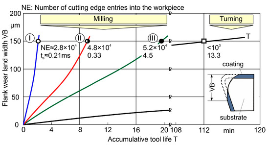 The flank wear width (VB) evolution versus the accumulative tool life T is illustrated in Figure 12. The tool life improvement up to VB of 0.15 mm (VB0.15) is apparent when increasing the cutting edge entry impact duration te. An accumulative tool life of approximately 20 min is reached at a te of 4.5 ms (see Figure 12). Considering related results introduced in [1], the tool life is already stabilized at te of around 1 ms. The reason for that will be explained in Section 5.3. In comparison, for turning, the obtained tool life is substantially longer, amounting to about 112 min. However, the estimated number of tool entries (NE) into the workpiece in turning associated with possible process breaks due to machine-tool adjustments, workpiece changes, inspections, etc., potentially summing up to a few hundred, is significantly less than the corresponding numbers in milling; which amounts to tens of thousands in all investigated cases (see Figure 12). Herein, the attained tool life of around 112 min is considered as unrealistic. Its reduction can be achieved via the cutting speed increase which is associated with a productivity improvement.