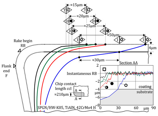 Furthermore, the wear status of the tool rake at a VB of 0.15 mm (VB0.15) on the flank is demonstrated in Figure 13, for various cutting edge entry impact durations te. The graphs in this figure illustrate the related worn rake-surface geometries, which are drawn according to the measurements on the sections AA near the cutting edge, as already described. The related measurement graphs are presented at the bottom of Figure 13.