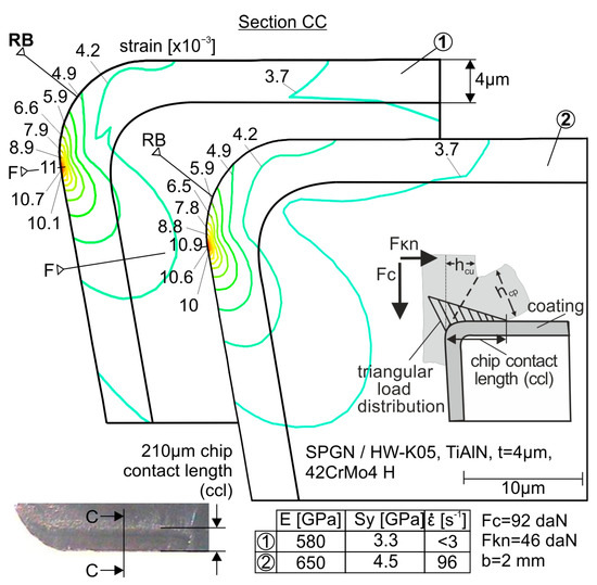 To theoretically clarify these mechanisms, the stress and strain fields occurring in the coating and its substrate during milling were determined. Relevant results concerning the developed strain fields are demonstrated in Figure 14. The related calculations were performed using an FE model of the cutting edge. In this model, the cutting force components Fc and Fκn were considered, as exhibited in Figure 14. These were measured in turning for the cutting conditions presented in Figure 10a. To define the loads on the superficial rake nodes of the cutting edge FE model, a triangular load distribution was assumed within the tool contact length with the chip (ccl).
