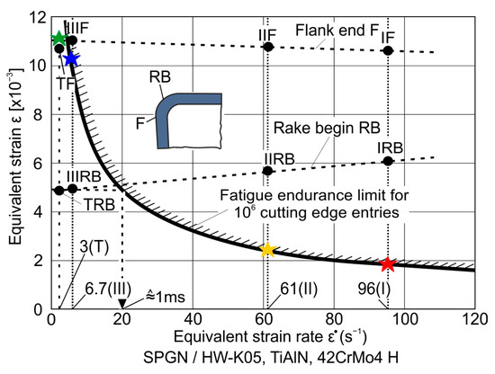 The strain and strain-rate data demonstrated in Figure 9 are considered in the following to predict a potential start of the coating fatigue failure and evolution on the cutting edge flank and rake. The diagram of Figure 9 is illustrated in Figure 15 with linear scales in both axes for simplification reasons.
