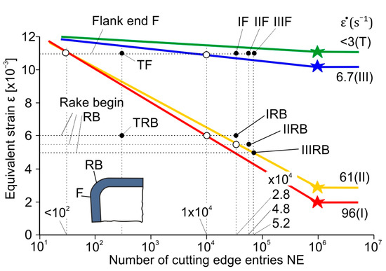 The points of the curve in Figure 15 refer to fatigue critical strain and strain-rate pairs of the applied coating. The Woehler-like diagrams associated with these critical strains versus the number of cutting edge entries NE into the workpiece material are presented in Figure 15. The four points marked with a star in the diagrams of Figure 14 and Figure 15 indicate the relevant fatigue critical strains to the applied strain rates (Figure 14), and to NE (Figure 15) in the conducted turning (T) and milling (I, II, III) investigations.