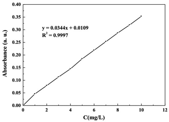 From Figure 1, it can be seen that the maximum absorption wavelength of the AR solution is located at 522 nm, so the absorbance of the AR solution in the subsequent degradation experiments was measured at the wavelength of 522 nm. A series of AR solutions of 1 mg/L, 2 mg/L, 3 mg/L, 4 mg/L, 5 mg/L, 6 mg/L, 7 mg/L, 8 mg/L, 9 mg/L, and 10 mg/L were prepared, and the absorbance values were measured at 522 nm. The concentration (C)–absorbance (A) standard curves are plotted in Figure 2.