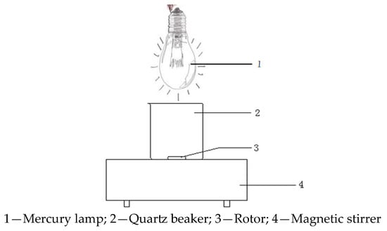 The photocatalytic activity of the prepared C3N4/BiOI/tourmaline catalysts was evaluated using a self-designed reactor (100 mL quartz beaker) under visible-light irradiation from a 250 W mercury lamp (Shanghai Yamin Lighting Co., Shanghai, China) at a distance of 10 cm from the quartz beaker. Before irradiation, 10 mg of C3N4/BiOI/tourmaline catalyst was dispersed in 10 mg/L AR solution and stirred vigorously and thoroughly in the dark for 30 min to establish the adsorption–desorption equilibrium between the photocatalyst surface and the contaminant molecules. The amaranthine degradation efficiency was determined by applying a UV-2550 spectrophotometer (Shanghai Yuan analytical Instrument Co., Shanghai, China) with a wavelength of 522 nm and taking samples at ten-minute intervals. The 100 catalysts that had undergone one degradation were recovered, dried, and then subjected to the same photocatalytic degradation experiment, which was repeated four times to determine the stability of the C3N4/BiOI/tourmaline catalysts. To investigate the photocatalytic mechanism, disodium ethylenediaminetetraacetate (Na2-EDTA) as a trapping agent for h+ group, p-benzoquinone (BQ) as a trapping agent for –O2− group, and isopropyl alcohol (IPA) as a trapping agent for -OH group were added to the reaction system and free radical scavenging experiments were performed to determine the main active substances in the photocatalytic process. A diagram of the photodegradation setup for the photocatalytic experiment is shown in Figure 3.