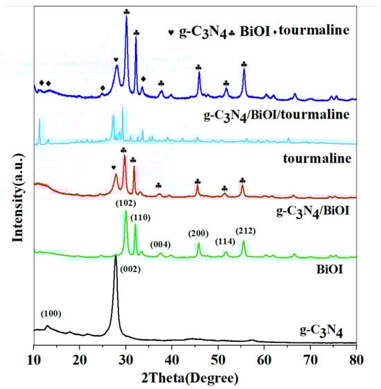 XRD spectrum of g-C3N4, BiOI, g-C3N4/BiOI, tourmaline, and g-C3N4/BiOI/tourmalines.