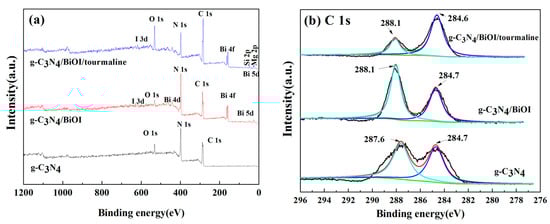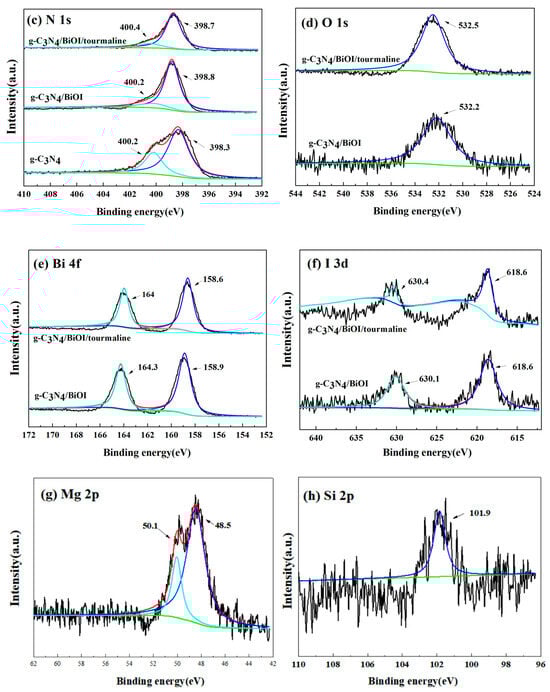 The elemental valence and chemical composition of g-C3N4, g-C3N4/BiOI, and g-C3N4/BiOI/tourmaline were analyzed using XPS, and the results are shown in Figure 6. Figure 6a shows the full spectra of the samples, and elemental C, N, and O are observed in the measured spectra from 0 to 1200 eV for both the g-C3N4 material and the g-C3N4/BiOI composite; elemental Bi and I are also present in the g-C3N4/BiOI composite, whereas the characteristic peaks of the elemental Mg and Si are also observed in g-C3N4/BiOI/tourmaline, from the tourmaline. Therefore, the results of XPS tests indicate that the g-C3N4/BiOI composites and g-C3N4/BiOI/tourmaline composites were successfully prepared and do not contain other impurity elements. Figure 6b shows the XPS high-resolution spectra of the C 1s state. The peak at 284.7 eV for pure g-C3N4 corresponds to C–C or C=C, the peak at 287.6 eV is related to the sp2 hybridization of g-C3N4 (N–C=N) [10], and the peaks at 284.7 eV and 288.1 eV appearing in the C 1s spectra of g-C3N4/BiOI and the two peaks at 288.1 eV and 284.6 eV in g-C3N4/BiOI/tourmaline are the same as the two peaks in pure g-C3N4. Figure 6c shows the XPS high-resolution spectra of the N 1s state. The N 1s spectra of pure g-C3N4 and g-C3N4/BiOI are basically the same, and the main peaks at 398.8 eV and 398.3 eV can be attributed to the presence of nitrogen sp2 hybridized by the bonding of the N of g-C3N4 with the C in the g-C3N4 and g-C3N4/BiOI composites. And the peak observed at 400.2 eV is assigned to the tertiary nitrogen group, which is in good agreement with previous reports [11]. The N 1s spectra of g-C3N4/BiOI/tourmaline are essentially the same as the other two samples, with peaks observed at 398.7 eV and 400.4 eV. As shown in Figure 6d, showing the XPS Gaussian fitting curve of the O 1s state, two different types of O are present in the g-C3N4/BiOI sample: the lower binding energy at 530.8 eV represents the hydroxyl (–OH) adsorbed on the lattice oxygen of BiOI, whereas the higher binding energy at 532.2 eV correlates with chemisorbed oxygen in the oxygen-deficient region of the surface (surface oxygen and hydroxyl) [12]. And surface oxygen and hydroxyl groups are able to trap photogenerated electrons and holes to generate strongly oxidizing hydroxyl radicals. The comparison with g-C3N4/BiOI shows that g-C3N4/BiOI/tourmaline has only one oxygen peak with a higher binding energy of 532.5 eV, while it does not have the lattice oxygen of BiOI, which may be due to the fact that the addition of tourmaline improves the surface structure of g-C3N4/BiOI, and the electric field of tourmaline causes the decomposition of water to produce more –OH, which leads to an increase in reactive oxygen in water [13]. The peaks located at 164.3 eV and 158.9 eV shown in Figure 6e correspond to the binding energies of Bi 4f5/2 and Bi 4f7/2, respectively, confirming the presence of elemental Bi in the form of Bi3+ [14]. The peaks located at 630.1 eV and 618.6 eV shown in Figure 6f correspond to the binding energies of I 3d3/2 and I 3d5/2, respectively, confirming the presence of the element I in the I− form. The g-C3N4/BiOI has peaks in the spectra of the corresponding monomers, and the XPS results are sufficient evidence that the g-C3N4/BiOI composite catalysts were successfully synthesized, which is consistent with the previous XRD results. In addition, the small shifts in binding energies indicate a change in their chemical environments, further confirming that the heterojunction between g-C3N4 and BiOI was successfully constructed. Figure 6g shows peaks located at 50.1 eV and 48.5 eV, which correspond to the binding energies of Mg 2p1/2 and Mg 2p3/2, respectively, and Figure 6h shows peaks located at 101.9 eV, which correspond to the binding energy of Si 2p; in addition, the small shifts in the binding energies suggest a change in their chemical environments.