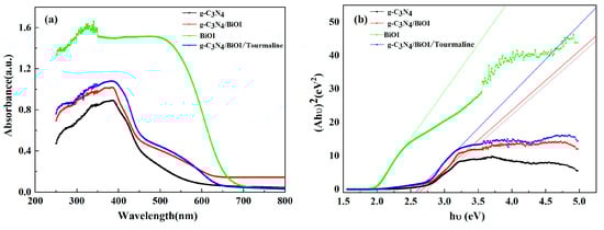 (a) UV–Vis DRS spectra of -C3N4, BiOI, g-C3N4/BiOI, and g-C3N4/BiOI/tourmaline; (b) estimated band gap.
