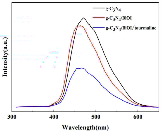 PL spectra of g-C3N4, g-C3N4/BiOI, and g-C3N4/BiOI/tourmaline.