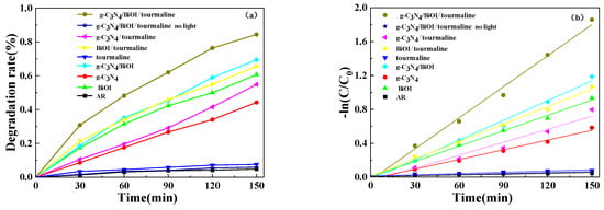 In order to investigate the photocatalytic performance of g-C3N4/BiOI/tourmaline composites under light irradiation, degradation experiments were conducted on AR solutions. The degradation experiments of the AR solution with different combinations of materials were compared, and the experimental results are shown in Figure 9. As shown in Figure 9a, the efficiencies of g-C3N4 and g-C3N4/BiOI were 44.21% and 69.48%, respectively. This is due to the fact that the addition of BiOI expands the visible-light response range of g-C3N4, forms heterojunctions in the composites, and improves the photocatalytic efficiency. The degradation rate of tourmaline was 7.56% and did not have a catalytic effect by itself, while both g-C3N4/tourmaline and BiOI/tourmaline showed improved degradation compared to pure g-C3N4 and BiOI, 54.87% and 65.65%, respectively, and the addition of tourmaline improved the efficiency of a single material. g-C3N4/BiOI/tourmaline catalysts showed higher removal rates than any of the other catalysts, and the degradation rate was 84.43% after 150 min of light. g-C3N4/BiOI/tourmaline had the highest degradation rate. Figure 9b clearly shows that there is a kinetic linear relationship for the degradation of AR by each sample, which indicates that the degradation process of AR by all samples is highly consistent with the quasi-level kinetic equation. As shown in Table 1, the rate constant of g-C3N4/BiOI/tourmaline is 0.0122 min−1, which is significantly higher than the other samples and 1.56 times the degradation rate of pure g-C3N4/BiOI. This indicates that the addition of tourmaline contributes to the improvement in g-C3N4 photocatalytic performance. The reason for this may be that the addition of tourmaline greatly improved the absorbance of the samples, which is related to the effective separation of electron–hole pairs due to the strong electrostatic field of tourmaline, leading to an increase in photocatalytic activity [17].