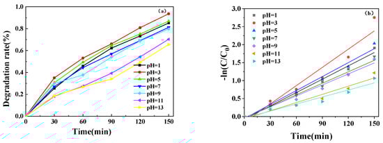 The initial pH of the solution determines the nature of the surface charge, the size of the formed aggregates, the charge of the dye molecules, the adsorption of the dye on the surface, and the concentration of hydroxyl radicals, becoming an important parameter affecting the catalytic oxidation [19]. The effect of pH on AR photodegradation was studied in the pH range of 1–13. From Figure 11a and Table 3, it can be seen that for the dye removal, the degradation rate from pH 1 to 13 increases and then decreases, and the highest photocatalytic degradation rate was observed at pH 3 with a maximum degradation rate of 93.63% and a maximum k of 0.0169 min−1. From Figure 11b, it can be seen that −ln(C/C0) shows a linear relationship with t, which is in accordance with the quasi-first-order kinetic equation. This is because the acidic pH favors the generation of hydroxyl radicals, probably due to the positive charge of the catalyst solution in the acidic solution, which facilitates the movement of photogenerated electrons to the photocatalyst surface [20].