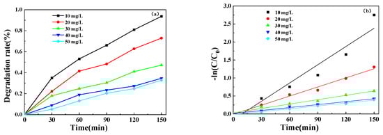 (a) Variation in degradation rate of solution with the initial concentration; (b) effect of initial concentration on degradation kinetics.