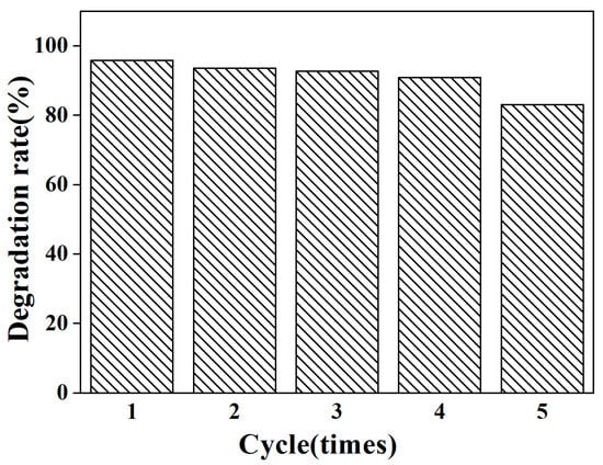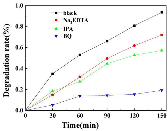 The removal of organic pollutants is attributed to the generation of various strong oxidizing substances (reactive groups such as h+, –OH, SO4−–, and –O2−) in the photocatalytic reaction. To investigate the main reactive substances in this process, free radical scavenging experiments were performed. The results of the experiments are shown in Figure 14.
