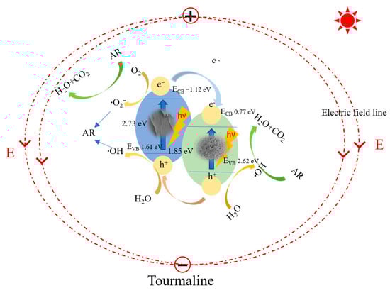 In addition, the electric field, far-infrared radiation, and polar coordination of tourmaline increase dissolved oxygen in water by ionizing water molecules and promote the degradation of AR [29]. The electric field of tourmaline drives the migration of photogenerated electrons and holes in g-C3N4 in opposite directions. The diffusion of electrons to the positively charged end of tourmaline and holes to the negatively charged end of tourmaline can promote the separation and transport of electrons and holes generated by g-C3N4 and BiOI, prolonging the lifetime of charge carriers and contributing to enhanced photodegradation activity [30]. And the electrons of g-C3N4 can react with adsorbed oxygen to generate –O2− radicals with strong oxidizing ability, because the conduction band potential energy of g-C3N4 is higher than that of O2/–O2− (−0.33 eV) and the valence band potential energy of g-C3N4 (+1.61 eV) is lower than the reduction energy of OH/–OH (+2.38 eV) and H2O/–OH (+2.72 eV). The EVB of BiOI is also higher than that of OH/–OH (+2.38 eV) active species [31]. This shows that –O2− is more oxidizing compared to other radicals, and, in agreement with the results of the radical experiments, can directly react with dye molecules to form the final product.