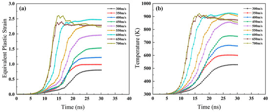 It is not difficult to see from Figure 7a that when the impact velocity is lower than 600 m/s, the changes in PEEQ are similar; the PEEQ for a period of time and tends to be smooth. With the increase in impact velocity, the PEEQ shows an increasing tendency, indicating a more intense degree of plastic deformation at a higher impact velocity. When the impact velocity reaches 600 m/s or above, the PEEQ changes abruptly within 10 ns to 15 ns, especially when the impact velocity is higher than 600 m/s. The PEEQ increases rapidly in a short time and fluctuates to a certain extent. It can be seen from Figure 6 that the effective plastic strain and fluctuation appear at the same impact moment, which means that adiabatic shear instability occurs in the particles. The main reason is that when the impact velocity of the particles reached the critical velocity, the increase in particle temperature led to the heat softening effect, which even exceeded the work hardening effect [55]. At the same time, the equivalent plastic strain and temperature show a downward trend, because the equivalent plastic strain energy will transform into internal energy during the deposition process of particles in the substrate [56]. Many studies had already shown that in the process of cold spraying, when the adiabatic shear instability occurs in the particle, the particle can be effectively deposited onto the substrate [30,31,33]. When the impact velocity is 600 m/s, the phenomenon of adiabatic shear instability has occurred in the particle, so it is reasonable to speculate that 600 m/s may be the critical velocity for the deposition of an NiCoCrAlY particle on the superalloy substrate.