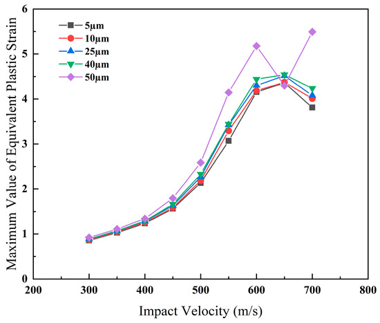 Figure 9 shows the maximum PEEQ and impact velocity of the particle and substrate with different particle sizes. When the impact velocity is below 600 m/s, the maximum PEEQ increases with the increase in impact velocity and particle size. The maximum PEEQ of particles with diameters of 5 μm, 10 μm, 25 μm and 40 μm shows the same trend on the whole, the maximum PEEQ tends to be flat when the impact velocity is in the range of 600~650 m/s, then decreases when the impact velocity has increased to 700 m/s, which may be due to the fact that the particle has already reached the critical velocity, and adiabatic shear instability occurs. When the diameter is 50 μm, the maximum PEEQ increases in the range of 500~550 m/s and decreases at the velocity of 650 m/s. Studies [37,43,57] have further shown that when the particle size increases to a certain size, its critical velocity decreases. Larger particles are more likely to deposited when the velocity of particles with small size also decrease equally; due to their higher critical velocity than the corresponding critical velocity of large particles, small particles may not be able to deposit on the substrate. In addition, a larger particle will carry more kinetic energy, and the kinetic energy can transform more plastic strain energy, making it easier for larger particles to be deposited on the substrate. In addition, as it is well known, kinetic energy is positively correlated with the square of velocity and also with mass. However, when the critical velocity of large particles decreases, under the same spraying parameters, the velocity of particles coming out of the spray gun is basically fixed. More particles will come out of the spray gun exceeding the critical velocity. Due to the larger mass of large particles, they carry more kinetic energy, which is more conducive to their deposition on superalloy substrates. Therefore, it shows that when the particle size is within a certain limit, when the size of the particle increases, its critical velocity will decrease.