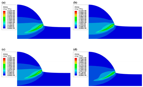 PEEQ of particle with different size (a) 5 μm, (b) 10 μm, (c) 40 μm, (d) 50 μm at the impact velocity of 600 m/s.
