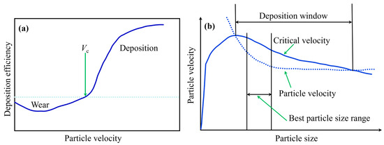 The intrinsic relationship between critical velocity, particle velocity, and particle size. (a) The relationship between deposition efficiency and particle velocity. (b) The relationship between particle velocity and particle size.