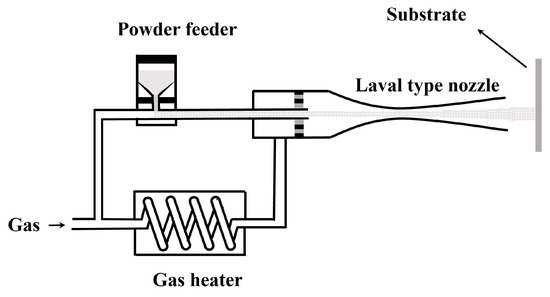Cold spray is a new coatings preparation process developed recently. In the mid-1980s, A.N. Papyrin and colleagues performed a wind tunnel experiment and found that when the velocity of solid particles exceeds a certain value, the effect of the particles on the substrate will be converted from erosion to deposition, so the concept of cold spray has been proposed [1]. In this process, the powder particles (usually 5~50 μm in diameter) are accelerated to a high speed (typically 300~1200 m/s), and they undergo intense plastic deformation [2,3]. In recent years, the deposition and preparation of various materials, such as pure metals, metal alloys, composites and some ceramic materials can be obtained via the cold spray process [4,5,6]. Cold spray technology has the characteristics of low deposition temperature, low porosity, low oxygen content, high bonding strength and high hardness of the deposited layer [7,8,9], which is commonly used in surface repair, surface enhancement, additive manufacturing of metal and alloy parts, etc. [10,11,12,13].