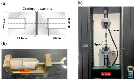 (a) specimen in the adhesion strength test; (b) schematic illustration of curing clamp; (c) image of adhesion strength test.