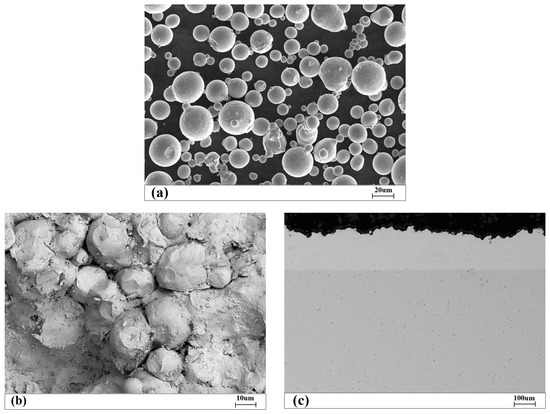 SEM image of (a) powder particles topography, (b) surface topography of NiCoCrAlY coating, (c) cross-section of NiCoCrAlY coating.