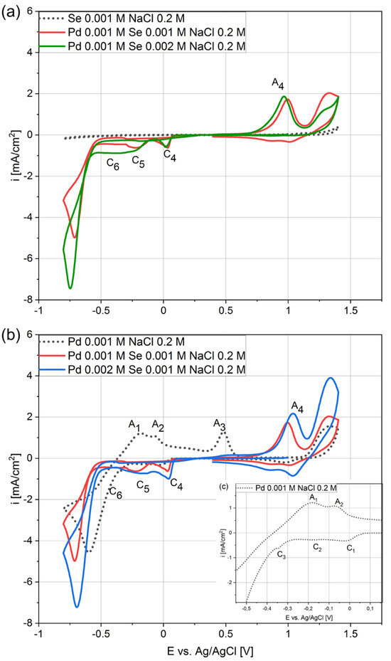 Figure 1 presents graphs with voltammograms for the solutions containing palladium or selenium ions and both elements in different stoichiometric ratios. The different stoichiometric ratios allow us to determine the influence of individual elements’ concentrations in the electrolytes on the kinetics of the process. The analysis of the electrodeposition of palladium and selenium alone is comprehensively described in the literature [27,35]. However, there is no analysis of the mechanism behind the co-deposition of both elements.