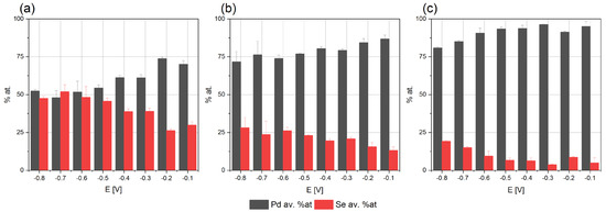 Elemental compositions of coatings electrodeposited for different potentials from baths: (a) 0.004 M PdCl2, 0.008 M H2SeO3, 0.2 M NaCl, (b) 0.008 M PdCl2, 0.008 M H2SeO3, 0.2 M NaCl, (c) 0.008 M PdCl2, 0.004 M H2SeO3, 0.2 M NaCl, pH = 2 on Cu/Au electrode, 800 rpm after annealing: 200 °C, argon atmosphere.