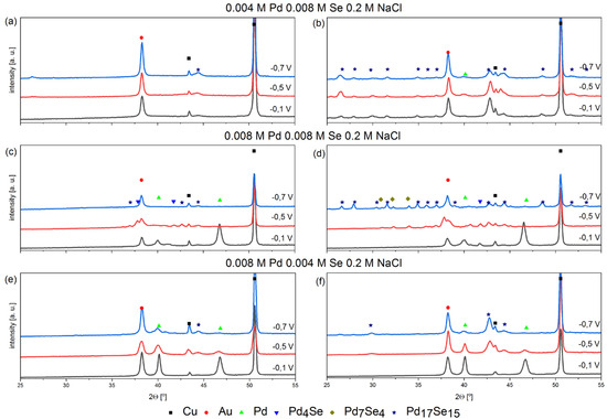 XRD patterns of electrodeposited coatings at different potentials from bath containing palladium and selenium ions with different stochiometric ratios, pH = 2 on Cu/Au electrode, 800 rpm, before annealing (a,c,e) and after annealing (b,d,f), 200 °C, 2 h, argon atmosphere.