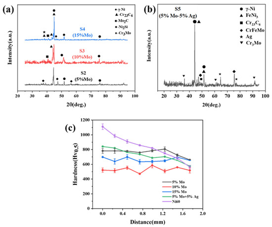 Figure 2 shows the X-ray diffraction (XRD) patterns of the S2~S5 cladding layer. The addition of Mo in the alloy led to the formation of a Mo2C-reinforced phase via carbon reaction at elevated temperatures, while another portion dissolved into a Cr-rich hard phase to form a solid solution. In Figure 2b, it could be found that Ag exists as an elementary substance, and Mo formed a solid solution with Cr.