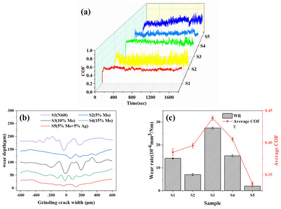 The COF curves of the cladding layers S1~S5 at room temperature are shown in Figure 3a. Table 6 presents the results obtained from calculating the average COF and wear rate of cladding layers. S5 exhibited the lowest COF and wear rate among the five cladding layers. Conversely, S3 exhibited the highest COF of 0.4355 and wear rate of 27.39 × 10−6 mm3/Nm. The addition of Mo initially increased and subsequently decreased the COF and wear rate, which was slightly higher than that observed for Ni60 without Mo at room temperature, suggesting that incorporating Mo did not contribute to an improvement in tribological properties under such conditions. For S5, its COF remained stable during the first 800 s and then experienced a slight decrease after a small increase, ultimately reaching its minimum value at room temperature. The simultaneous incorporation of both Mo and Ag elements in this study resulted in superior tribological performance under the given conditions.