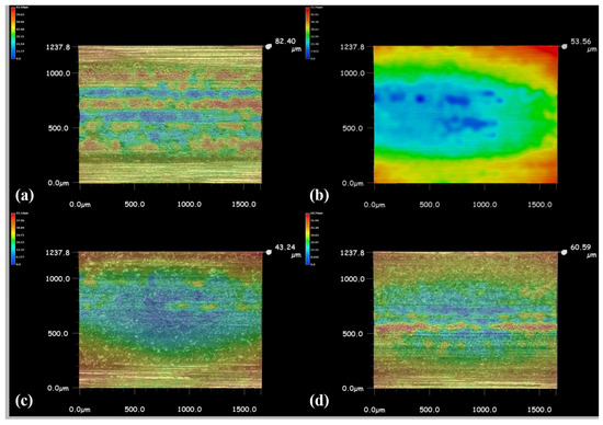 The 3D wear morphologies of cladding layers at 25 °C (a) S2; (b) S3; (c) S4; (d) S5.