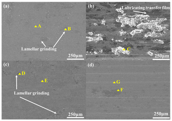 Figure 5 shows the worn surface morphologies of the S2–S5 cladding layers at room temperature, and the analysis results are shown in Table 7. The lamellar debris observed at points A and B in Figure 5a primarily indicated adhesion wear. Notably, the S3 cladding layer surface depicted in Figure 5b exhibited the most severe signs of wear. There was less wear on the surface of the S5 cladding layer in Figure 5d. Point G represented the elongated white tissue strip exhibiting 83% Ag content aligned with the direction of friction, indicating that Ag aggregated preferentially along this direction due to its relatively low hardness during the frictional process. It circumvented direct contact between the grinding ball and the cladding layer during operation, thereby minimizing the generation of wear particles and debris [22].