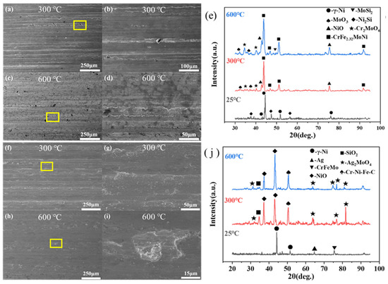 Figure 7a–e shows the worn surface morphologies and XRD patterns of the S2 cladding layer at high temperatures. The Figure 7b,d,g,i are magnified within the yellow box on the left. The cladding layer experienced more severe surface squeezing and deformation during the friction process. The surface of cladding layers exhibited friction grooves, as depicted in Figure 7a, accompanied by an extrusion layer featuring a distinct bright white edge. The friction surface of the cladding layer exhibited the formation of black oxide at 600 °C, resulting in more severe wear compared to that observed at 300 °C. During the friction process, wear debris became detached from the surface, thereby leading to an increase in both the wear rate and COF. Upon the magnification of 500, Figure 7d reveals the emergence of a white granular bulge, which was postulated to undergo an oxidation reaction at elevated temperatures, leading to the formation of MoO3, Cr2MoO6, and other oxides based on point-scan analysis [23]. The granular bulge of these oxides, formed at elevated temperatures, led to an increase in adhesion wear at 600 °C.