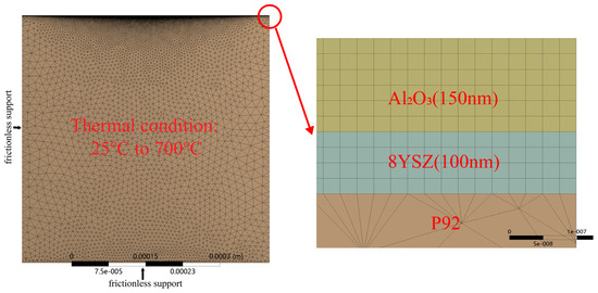 Static structural analysis was chosen to simulate the stress field. Frictionless support constraints were applied to the left edge and the bottom edge of the model to prevent any translation of each edge along its normal direction. The bond constraint was applied to each contact pair to prevent any relative tangential translation on the interfaces between them. In other words, all nodes of the contact surfaces will not change their relative positions. Those nodes located at the same point at the initial stage will always contact together. The temperature considered in the simulation increases linearly from 25 °C to 700 °C. Under this circumstance, the top coating would more likely peel off from the surface. The mesh, loading, and boundary conditions of the finite element modeling are shown in Figure 3.